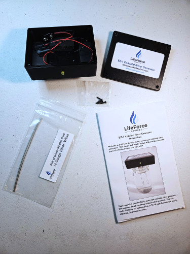 LifeForce Devices was created because we value the health and wellness of every individual on our beautiful planet Earth. We are committed to making quality products at a price making them accessible to everyone. We also sell 9999 pure silver wire with a Certificate Of Analysis included with each order providing assurance of purity. The Compact EZ-1 Barebones Colloidal Silver Generator Package INCLUDES ONLY THE MACHINE, THE PAIR OF 9999 SILVER WIRES AND THE INSTRUCTION SET (EZ-1 Instructions, Why Colloidal Silver and Frequently Asked Questions). Click on the boxes below the title to select the silver wire gauge and view pricing (the glass tumbler is not included). The EZ-1 Barerbones Package has 3 variations: 14 gauge, 12 gauge and 10 gauge pair of 9999 pure silver wires. The timing chart is standardized for 6-inch 14 gauge silver wires, and due to the larger surface area, 6-inch 12 gauge silver wires will process 33% faster and 6-inch 10 gauge silver wires will process 50% faster. THE EZ-1 HAS A 1 YEAR REPAIR/REPLACEMENT GUARANTEE AGAINST DEFECTS IN MATERIALS OR ASSEMBLY AND FREE UNLIMITED TECHNICAL SUPPORT. The EZ-1 makes both clear and yellow cs, depending on the time period of operation. Using 14 gauge silver wires, 5 ppm and 10 ppm are clear, 15 ppm is faint yellow and 20 ppm is yellow. Above 20 ppm the colloidal silver is orange to reddish brown. The photo is 10 ppm. This is due to particle sizes. The smallest silver nano-particles are made at 5 ppm to 10 ppm and larger silver silver nano-particles that reflect yellow/orange/red light are made as the concentration increases. DISCLAIMER: This device and the product it generates are not intended to diagnose, treat, cure or prevent any disease. Consult your physician. RETURNS: A full refund of the purchase price up to 15 days after purchase, a 20% restocking charge past 15 days. No returns after 30 days.